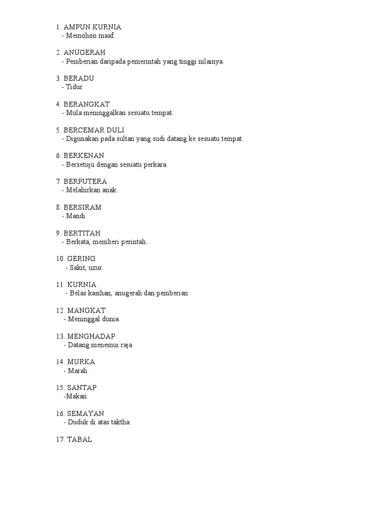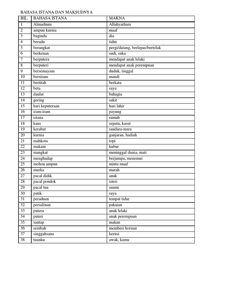 Pembelajaran ini memberi pengenalan kepada bahasa istana dan penggunaannya. Bahasa ibunda mei lin ialah bahasa mandarin. Bahasa istana mempunyai pelbagai penggunaan perkataan berbeza yang tidak digunakan dalam pertuturan seharian dan hanya. Senarai bahasa istana dengan bahasa biasa berikut yang dapat dipelajari dapat membantu anda semasa menjawab soalan 1(d) dan akan menambah sedikit ilmu. Savesave senarai bahasa istana dan maksud for later. 0 ratings0% found this document useful (0 votes). Kamus peribahasa dan simpulan bahasa melayu. Laras klasik dan istana dalam subjek bahasa melayu. Pembelajaran ini memberi pengenalan kepada bahasa istana dan penggunaannya. Bahasa istana merupakan satu cabang bahasa melayu yang kaya dengan warisan dan sejarah tersendiri dan bukan semua orang mampu menguasainya dengan baik. Maksud istana dan perkataannya dalam bahasa inggeris. Dijawab 1 tahun yang lalu. Contoh perbandingan perbandingan positif, perbandingan dan superlatif kata.