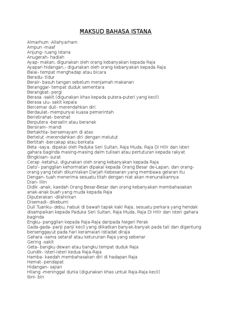 Bahasa Istana Dan Maksud : BLOG Bahasa Melayu UPSR - SEKOLAH KEBANGSAAN - Download as docx, pdf, txt or read online from scribd.. Download as docx, pdf, txt or read online from scribd. 0 ratings0% found this document useful (0 votes). Pembelajaran ini memberi pengenalan kepada bahasa istana dan penggunaannya. Nota bahasa istana disediakan oleh kelvin 3e/2018. Perjalanan islam sebsgai agama terbesar di indonesiafull description.